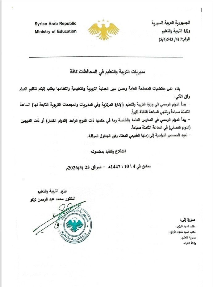حددت وزارة التربية والتعليم السورية، في تعميم صادر عنها اليوم الاثنين، الدوام الرسمي في المديريات والمجمعات التابعة لها عند الساعة الـ 8 صباحاً على أن ينتهي عند الساعة 3 عصراً.