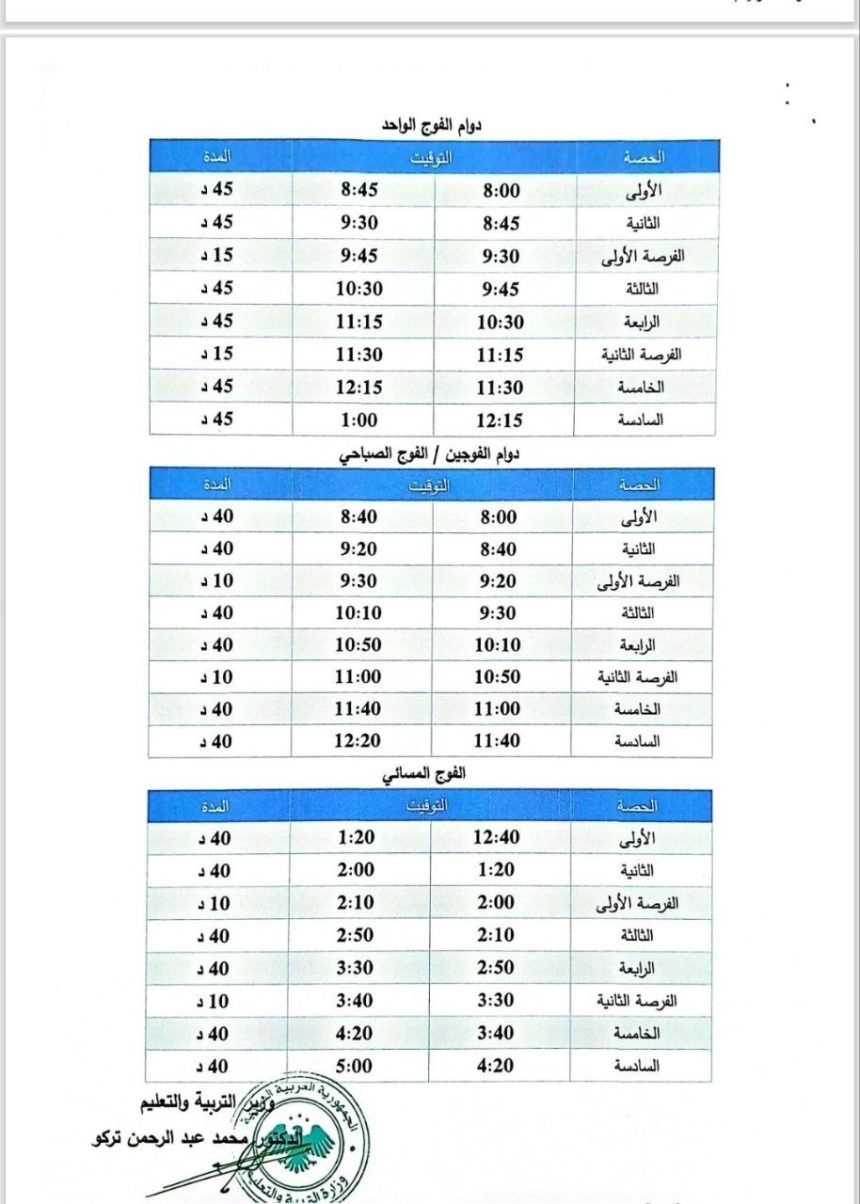 وبحسب التعميم، ينطلق دوام الفوج الواحد من الساعة الثامنة صباحاً للحصة الأولى إلى الساعة الواحدة ظهراً بالنسبة للحصة السادسة والأخيرة، أما فيما يتعلق بدوام الفوجين، فيبدأ دوام الفوج الأول الصباحي من الثامنة صباحاً وينتهي عند الساعة الثانية عشرة وعشرين دقيقة ظهراً، بينما يباشر الفوج المسائي دوامه من الساعة الثانية عشرة وأربعين دقيقة وينتهي عند الخامسة مساءً.