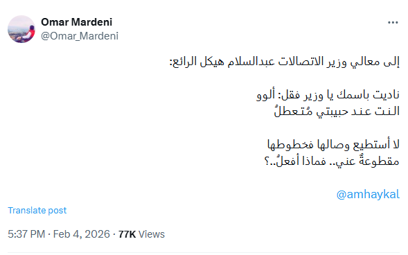 وفي وموقف لافت وطريف أيضاً، وجه مدون يدعى "عمر" قبل أيام قليلة، رسالة عتاب طريفة إلى وزير الاتصالات السوري عبد السلام هيكل عبر منصة "إكس"، شكا فيها انقطاع خدمة الإنترنت عن حبيبته، بصيغة شعرية قائلاً: