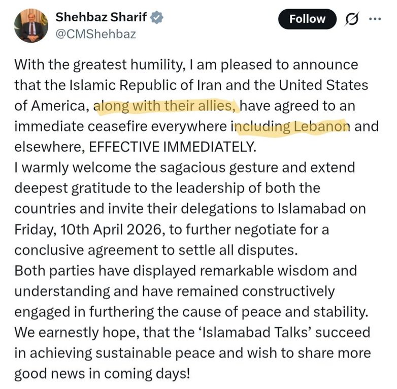 أرفق عباس عراقجي وزير الخارجية الإيراني تغريدة بصورة عن إعلان رئيس وزراء باكستان شهباز شريف، لاتفاق وقف إطلاق النار، الذي ينص على شمول لبنان.