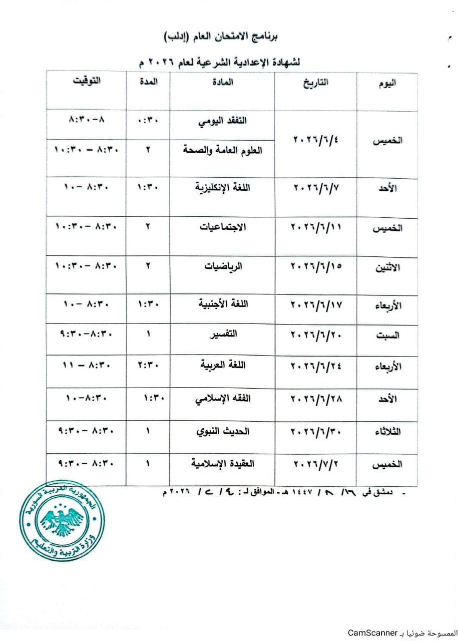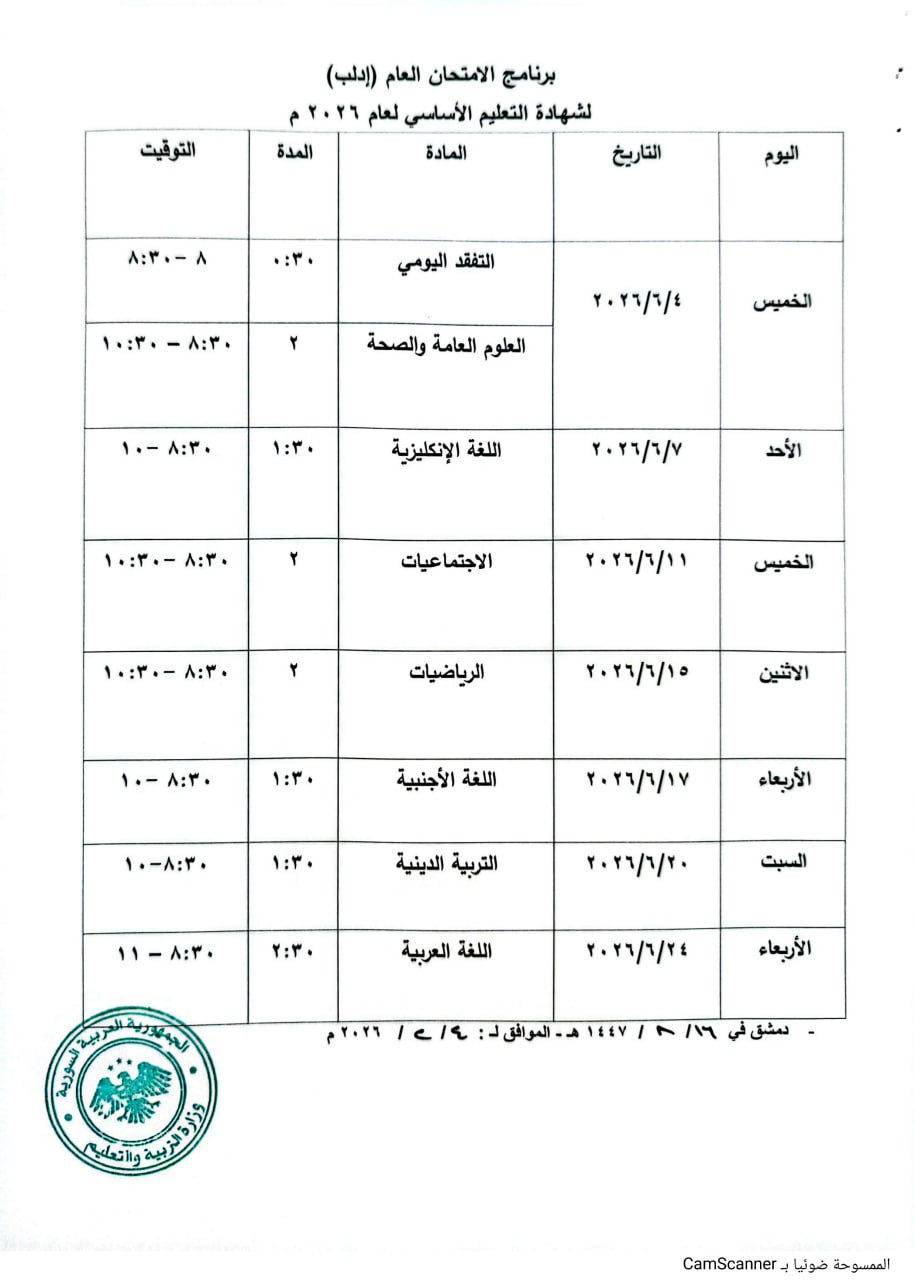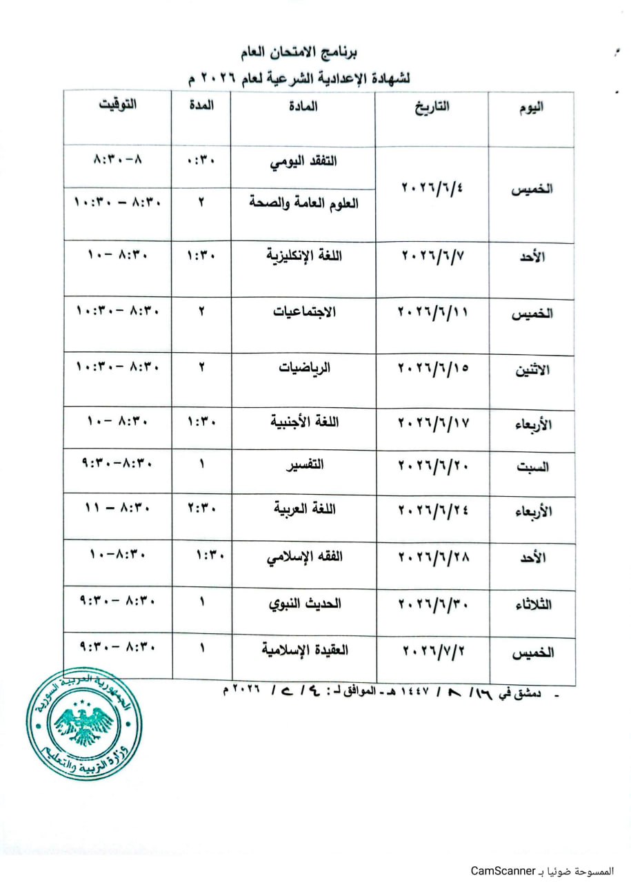 وزارة التربية السورية تصدر البرنامج الامتحاني لشهادة الثانوية العامة والثانوية الشرعية لعام 2026