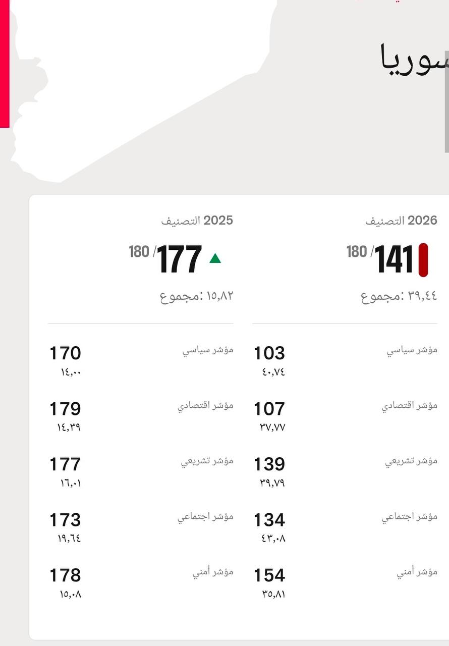 للمرة الأولى منذ سنوات، لا تأتي سوريا ضمن الدول الأخيرة في ذيل المؤشر. فقد سجّلت البلاد تقدماً لافتاً إلى المرتبة 141 عالمياً في عام 2026 من أصل 180، بعد أن كانت في المرتبة 177 عام 2025، و179 في 2024.